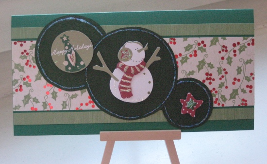 I have come across a website where I can see what other crazies like me do when it’s not exactly Christmas time – they make Christmas cards! This must be heaven 🙂 … and such a relief that others share my addiction… Anyway, it’s Christmas Cards All Year Round. How will I survive may almost one-month vacation starting March 27, traveling and not being able to make cards?! I guess I just have to be strong 😉 The March challenge on Christmas Cards All Year Round is to create five Christmas cards in mainly green that feature a snowman. The first one I made for that also fits the CPS sketch #157 – only that it’s not square. But I will pass on making square cards for the time being just because the postage for them is so incredibly expensive in Germany. Here’s the result: