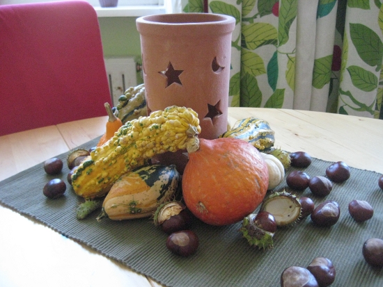 Yesterday was World Card Making Day! (So much for old news…) And I had such big plans – and then everything turned out very different. There were a few things to take care of before I was to get started on the planned projects. One of them was to collect a few chestnuts for today’s centerpiece to the left… I had a friend over for tea and cake. So I went out and successfully collected a few chestnuts. And on the way passed the Book Cupboard, or Books Outdoors as is the official English term.