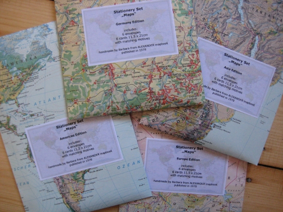 And all the plans I’d had until that moment were dust… I suddenly thought that these maps would make beautiful envelopes and soon discovered that I could even make matching note cards to go with them out of one page. Don’t get me wrong: I love books and map books in particular – I can spend hours just studying maps, I guess that’s when the geographer deep inside resurfaces – and the thought of treating books with anything less than care is foreign to me. I’m the kind of person who buys a book AGAIN when a glass of water was accidentally spilled on it. I hate dog-ears. You will not find books with broken spines on my shelves. Yet I was ready to tear apart this beautiful map book… I guess I felt that I was taking it to another state of being or something.