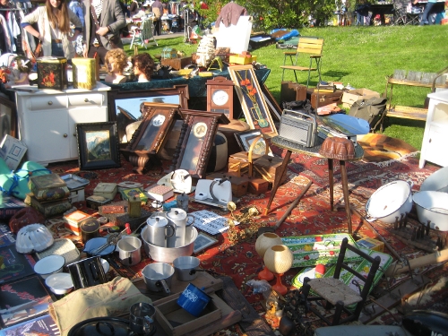 You can get everything there. Car tires, lawn mowers, vintage wall clocks, cartoon books, other books, porcellain, knickknack in all shapes and colors, clothes, shoes, cupboards… Why anybody would ever buy new toys again is beyond me. Some stands looked like a Playmobil factory outlet… only it was second-hand. I was very tempted to buy Legos by the bucket – it could be heaven on earth.