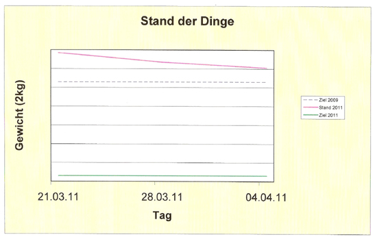 Es geht wieder los. Ich bin wild entschlossen. Bis Jahresende sollen vom erreichten Ziel 2009 weitere 10 kg runter. Das heißt: in 2011 sollen 13,1 kg weg… drei hatten sich wieder draufgelegt in 15 Monaten. Viel schlimmer noch: sie wirken wie sechs, weil ich aus Zeitmangel lange nicht mehr wirklich Sport gemacht habe. Und so sieht die Statistik aus: