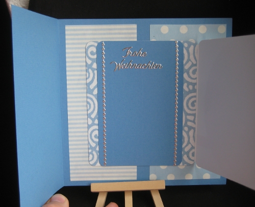 I was hoping for the forecast rains and thunderstorms to come – it would have felt more appropriate to spend most of the day in my apartment. Well… Anyway: what a cool thing over at ABC Christmas Challenge! I wasn’t really taken at first… a square again and then… everything somehow. A smaller card is tucked into a larger card and if all works well there is sort of a surprise when you open it. This is my first (!) creation for this challenge: