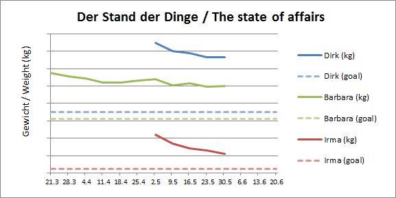 Diese Woche gab es ein Abschiedsessen im äthiopischen Restaurant, ein nettes Abendessen mit einer Kollegin (Pizza) und einen Kaffeeklatsch, der zwar nicht ganz verheerend, aber doch auch nicht förderlich war. Und dann die fiesen Methoden meines Mitstreiters Dirk, der seine Frau dazu aufforderte, mir Pralinen aus Brüssel mitzubringen…. Ein bisschen erfreulich, dass auch er stagniert, hähä. So sieht es denn nun aus: