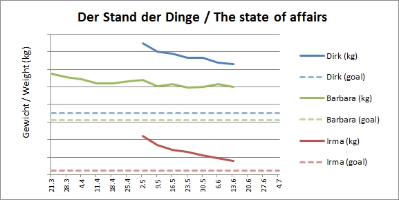 Hinter mir liegt eine weitere desaströse Woche im Wettstreit mit den Kollegen – Irma zieht uns davon und hat ihr Jahresendziel wahrscheinlich noch vor Monatsende erreicht. Obwohl sie nun festgestellt hat, dass ihr diese Metamorphose zu schnell ging – sie muss sich „erst emotional auf den neuen Körper einstellen.“ Naja, das wäre mein Problem nicht – da wäre ich ruckzuck unterwegs zum power shopping. Dirk hingegen war am Freitag sehr bedrückt, da er am Vorabend noch eine halbe Packung Vanilleeis verzehrt hatte. ZUSÄTZLICH zum Grillabend. Aber auch er liegt weiter gut im Rennen. Durch eine spontane Fahrradtour am Sonntag konnte ich nach Konsum von ca. 1 kg Schokolade über die Woche das Ruder gerade nochmal rumreißen und habe einen erneuten Trend nach unten angetreten. Bleiben wir optimistisch.
