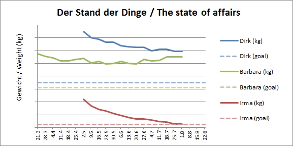 Tja, Dirk und Irma sind in Urlaub, das heißt, es gibt keine aktuellen Gewichtswerte. Und bei mir bleibt die Null-Linie.