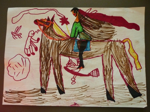 Hier interpretierte ich ja anfangs vollkommen falsch: es handelt sich im rechten Bildteil NICHT um Pferdeäpfel und die von ihnen ausgehende Duftwolke, sondern um Steine und eine Staubwolke, die der galoppierende Vierbeiner hinterlässt.