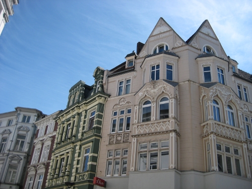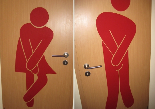 Man beachte den fantastischen blauen Himmel! Aber nein, es ging nicht um Architektur. Und auch nicht um kreative Toilettentüren in einem Bistro am Neuen Markt.