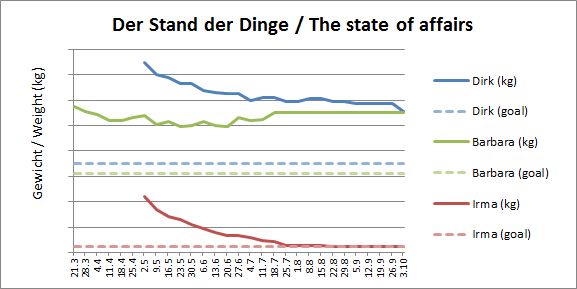 Mit genügend Sport könnte man ja trotzdem noch bei einem regel- wenn auch nicht übermäßigen Schokoladenkonsum bleiben. Aber ach! Viel wichtiger: die nächste Deadline stand an. Dirk wollte am 30.09.2011 20 kg abgenommen haben. Das hat er leider nicht geschafft, aber es sind immer noch beträchtliche (und äußerst sichtbare) 9,8 kg. Herzlichen Glückwunsch!