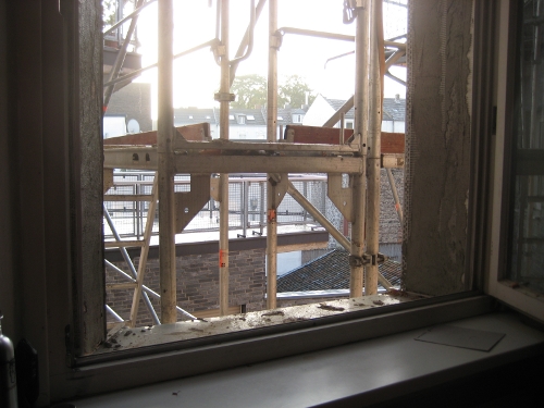 So langsam, ganz, ganz langsam, wäre es mir schon irgendwie recht, wenn die Arbeiten an der Außendämmung ein Ende fänden und das Gerüst wieder abgebaut würde. Das Dämmen an sich ist wohl fertig, aber es muss nun noch verputzt und gestrichen werden (Die Bauarbeiter sprechen nur Spanisch. Kommunikation war schwierig. „When will your boss be here?“ – „???“ – „Votre patron??“ – „El Jefe?“… Ja, genau der…). Dieser wunderbare Blick aus meinem Schlafzimmer wiederholt sich an allen anderen Fenstern meiner Wohnung…