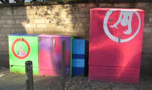 Aber der Tag war ja schön. Kalt, aber schön. „Der Jahreszeit entsprechend.“ Und weil ich nicht aus der Sonne wollte, habe ich mich in der Innenstadt auf so eine Art Schnitzeljagd begeben. Vor kurzem fiel mir auf, dass diese Kästen – was auch immer da eigentlich drin ist – mit Graffiti versehen worden waren.