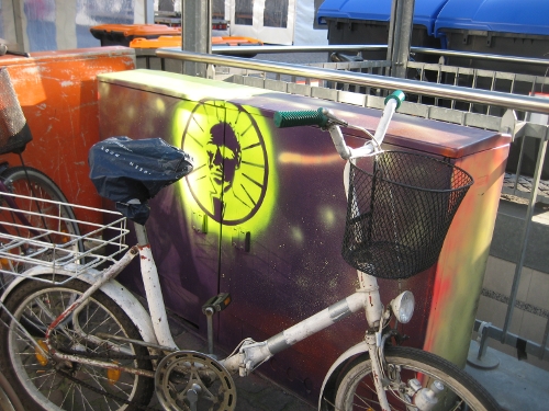 Maybe it’s got something to do with the link shown on the „six-pack“ above, at lower right. It takes you to a website advocating for the new festival hall. Mmh. Maybe I’ve first noticed the graffitis during this year’s Beethovenfest?? Anyway: that bicycle is cool, isn’t it? Have a nice weekend!