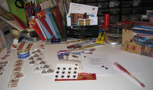 Meine Weihnachtspost will gut organisiert sein – erstens ist sie zahlreich und zweitens geht sie an teilweise ziemlich entfernte Orte… also werden zuerst mal die außereuropäischen Grüße geschrieben und auf den Weg gebracht. Ich könnte das ständig machen – das sind so Abende, die von mir aus immer weitergehen könnten, die Karten, die Accessoires, Frank Sinatra und ich.