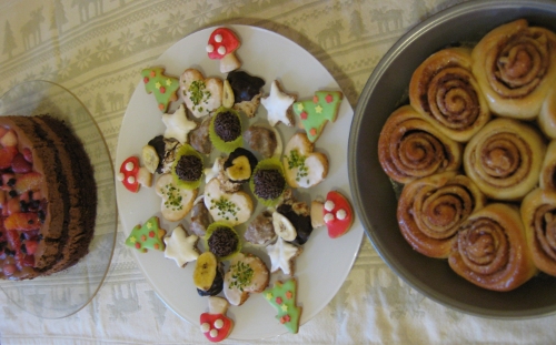 There has been a lot of activity in the Christmas bakery these past days and then the little companion who usually helps me with the colorful cookies had to cancel due to a toothache (poor little guy)… So I sat down by myself and made a few as I needed some accents for the plate. In addition to the cookies a Wintery Chocolate Spice Cake and a variation of the cinnamon rolls were on the menu. For lack of pecans I used walnuts for the latter. Yummy.