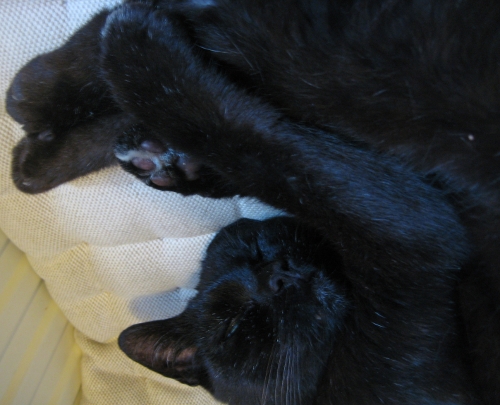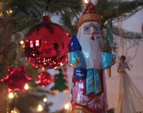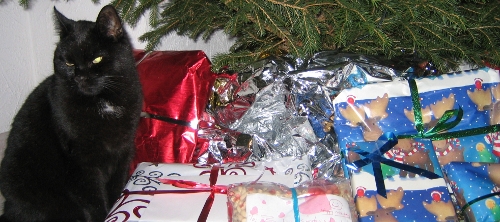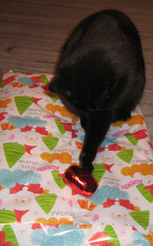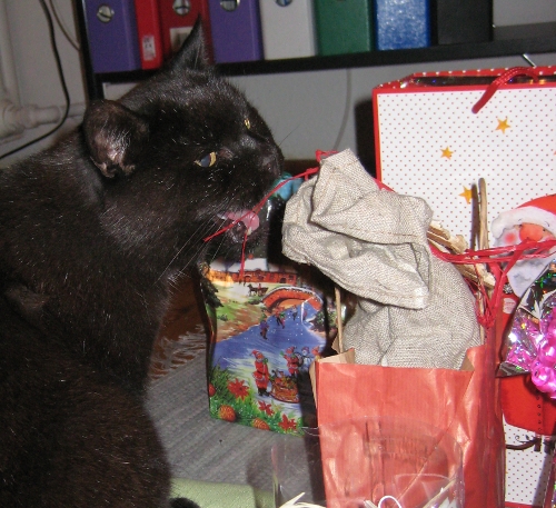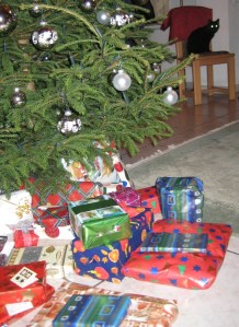 This is Sophie. Sometimes we call her Sophie-san. That first happened during the Nagano Olympic Games. When she really forgets all about manners, she’s Miss Sophie. And in particularly loving moments she’s [can’t translate]. If we remember correctly, she showed up at our doorstep at some point in 1993 – she’s been with us for a loooong time. And she’s always loved Christmas. In that sense she truly is „my“ cat.