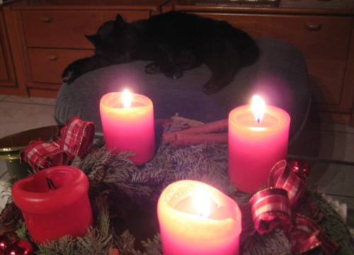 Und wenn es um Kerzenschimmer geht, sind wir ganz auf einer Linie. Aber was sie seit gestern macht, hat uns aus den Socken gehauen. Sie hat den ganzen Tag ihr Futter verweigert (oh ja, sie ist schon länger etwas wählerisch, aber bei einer Dame ihres Alters…), sich dann aber in einem unbeobachteten Moment über das Spritzgebäck einer Freundin hergemacht. Das war noch nicht der Hammer. Der Hammer ist, dass sie seitdem auch ihr Futter wieder frisst – so lange man ein Stück Spritzgebäck darüber zerbröselt. Das ist Weihnachten!
