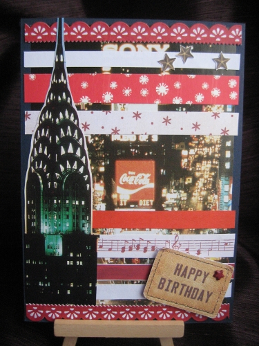 That is a wonderful card, I love NYC, and I happened to live there for 8 years. New York City doesn’t have that many scrapbook store, they don’t even have a Michaels’s until about 2 years ago, it is up on the upper west side, but Michael’s do not carry most brand except their own, they do have K and company, Tim Holtz and Martha Stewart though.