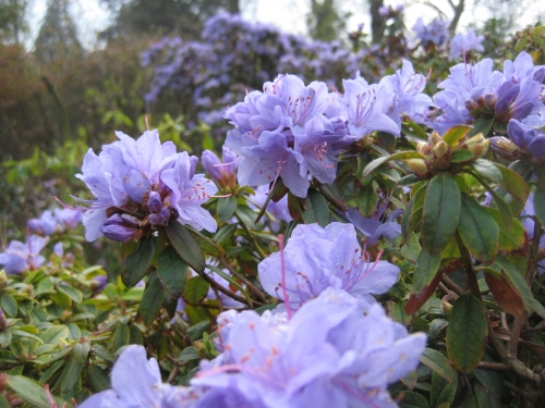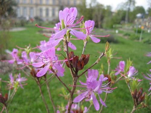 Und ich habe festgestellt, dass nicht nur im Rondell Rhododendrons stehen: die Rhodora Alpenrose (oder Rhododéndron canadénse – ja, ich habe das Schild fotografiert) oben habe ich in einem anderen Teil des Gartens aufgetan. Sie kommt aus dem östlichen Nordamerika. Wer hätte das gedacht.