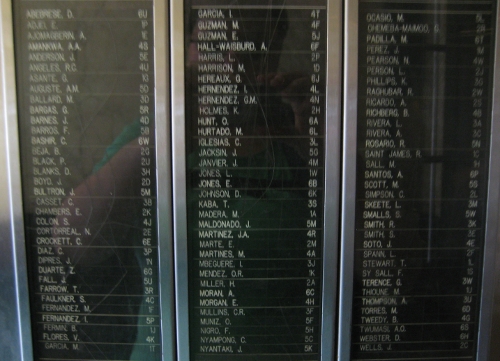 Nehmen wir mal, der besseren Leserlichkeit wegen, die mittlere Spalte: Garcia – Guzman – Guzman – Hall-W. – Harris – Harrison – Hereaux – Hernendez – Hernendez – Holmes – Hunt – Hurtado – Iglesias – Jacksin – Janvier – Jones – Jones – Johnson – Kaba – Madera – Maldonado – Martnez – Marte – Martines – Mbguere – Mendez – Miller – Moran – Morgan – Mullins – Muniz – Ngao – Nyampong – Nyantang. 34 Parteien, davon mit großer Wahrscheinlichkeit 15 mit hispanischem Hintergrund. Das sind knapp 50%. Bei den letzten dreien vermute ich asiatischen Hintergrund… knapp 10%. Kann man bei Kaba vielleicht auf die um den Grand Concourse konzentrierte ghanaische Community tippen? Ist Jacksin ein Tippfehler? Fragen über Fragen…