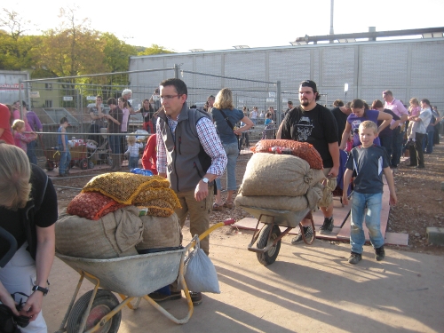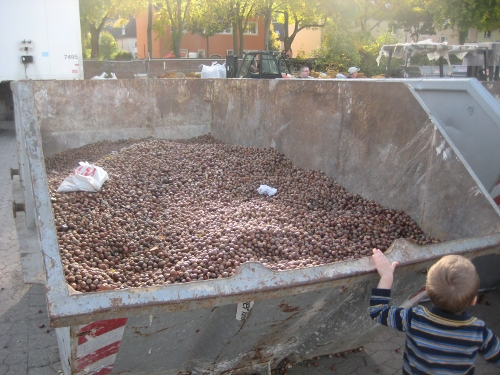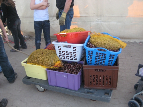 When I went to work this morning, I passed people carrying, pushing and pulling all kinds of containers… trash cans, wheel barrows, handcarts – you name it. And soon I realized what this was about: the great chestnut/acorn exchange at HARIBO. „Too bad,“ I thought, „it’s probably over by the time I get out this afternoon.“