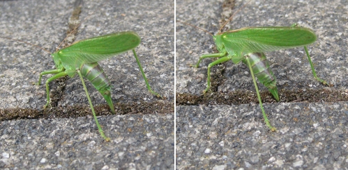 Dieser Grashüpfer ist erstmal ziemlich groß: Vom Kopf bis zur Flügelspitze etwa 8cm. Und dann denke ich, es war eine sie und gehe davon aus, dass Grashüpfer Eier legen. Denn sonst habe ich keine Erklärung für ihr Verhalten. Wir saßen auf der Bank und haben sie sicher 30 Minuten beobachtet. Wie mit einem langen Stachel hatte sie in die Fuge zwischen den Steinen gebohrt und es sah aus, also ob sie da was reinpumpen würde. Dabei hat sie sich derart angestrengt, dass man sie atmen sehen konnte. Oder zittern.