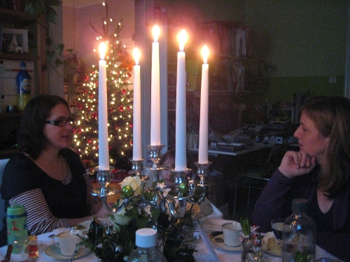 We had a marzipan cake, apple strudel with vanilla ice-cream and Christmas cookies (which were mainly eaten by Lars!) with the coffee and a „crispy chestnut soup“ with sandwiches for dinner. And a lot else in between, as usual 😉
