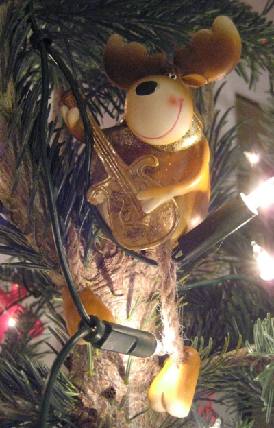 But this year there’s a new kid on the block. He’s been with me for a while but never found the right spot. But this tree is a special one. If you look closely you will notice it has two tops. And this laid-back moose knew immediately: that’s where he had to sit!