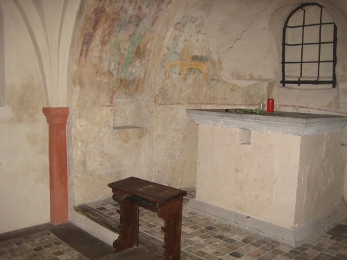 There is a small plaque letting you know what to find at the top of the stairway and somehow it is a bizarre thought. But it’s really this little chapel, 3.5 by 3.5 meters (11.5 by 11.5 feet), Saint Helen’s Chapel. According to legend it was built when Saint Helena visited in AD 330 – but the architectural style tells the experts it was built more towards the end of the 12th century, AD 1160, in the Romanesque period. And when you look out of one of its two windows, you get a blurry glimpse of the latest trends in fashion.