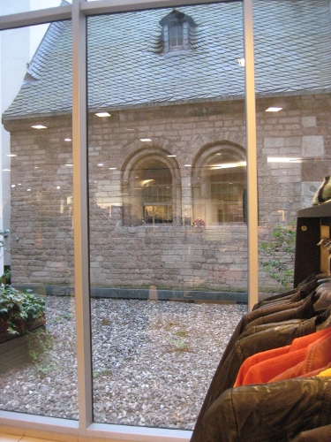 Die heutige Lage ist ja sehr besonders – ich würde zu gerne wissen, wie die Gesamtanlage im Original wohl ausgesehen hat. Im Kaufhaus steht ein Schild, das (u.a.) beschreibt, dass es eine Hauskapelle war, die im zweiten Stock eines Tuffsteinbaus angesiedelt war. Im Netz findet man hier detaillierte Infos zur Historie und hier noch weitere und deutlich bessere Fotos. Und weil es ein so stiller Ort im vorweihnachtlichen Einkaufschaos ist, wird es mein Beitrag bei Our Beautiful World diese Woche, wo es um Stille geht.