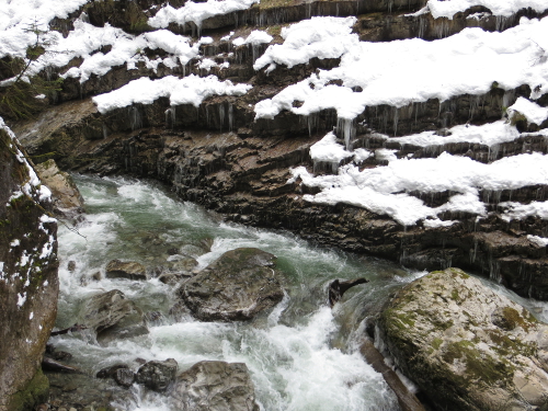 Die fast senkrechten Wände der Breitachklamm sind gut 90 Meter hoch und teilweise nicht weiter als zwei Meter voneinander entfernt. In den letzten Tagen ist wohl ziemlich viel Schnee geschmolzen, was für die Atmosphäre in der Klamm sehr förderlich war: es war ein Riesengetöse und in den „Strudeltöpfen“, die durch das mitgeführte Material ausgeschliffen wurden, wurde das sonst eher grünliche Wasser zu einer weißen, brodelnden Masse.