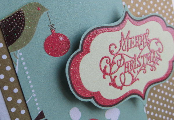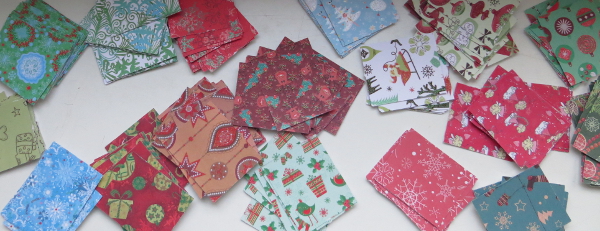 Yes, I unexpectedly got around to playing along at the current challenge over at the Jingle Belles, that is to celebrate Earth Day by re-cycling, re-using or up-cycling. I immediately thought of the leftovers from last year’s advent fundraiser for the hospice: about 200 little rectangles like the ones below and matching strips the size of a bookmark. I just couldn’t throw them away.