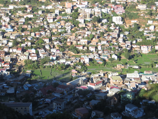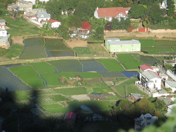 Antananarivo („Stadt der Tausend“), so der eingängige Name der Hauptstadt – gern auch kurz Tana – ist, wenn nicht auf einem der vielen Hügel, auf entwässertem Gebiet gebaut. Das Wasser findet man heute im ansehnlichen Lac Anosy, gleich beim Fußballstadion. Aber nicht nur dort: immer mal wieder findet man Streifen mit Reisfeldern mehr oder weniger mitten in der Stadt. Hier hat die urbane Landwirtschaft offenbar Tradition. Und weil ich den Blick von oben liebe (und mich nicht entscheiden konnte), kommt hier die erste kleine Reihe. Ich habe das Gefühl, es werden noch viele weitere kommen…