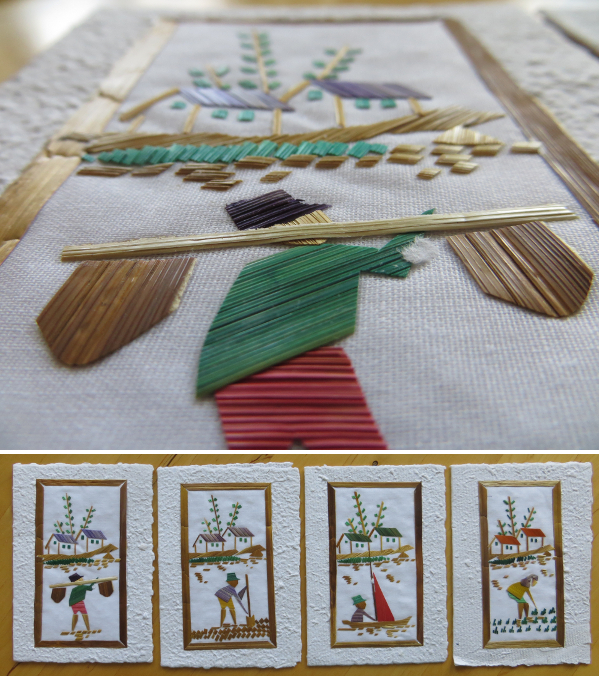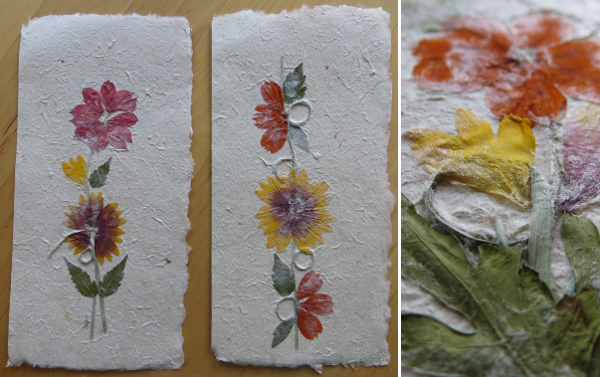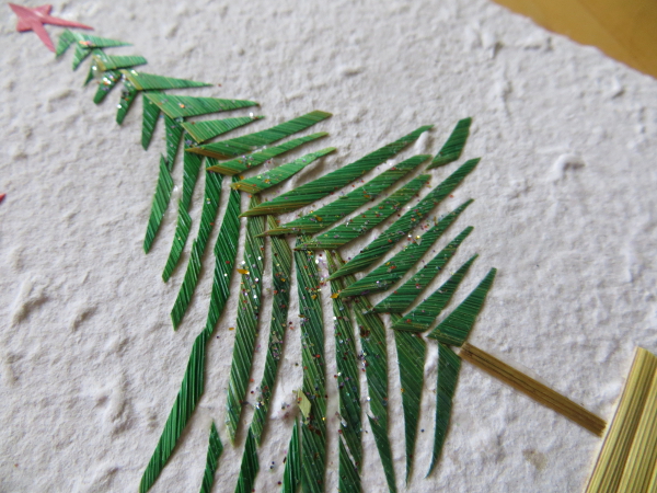 Of course I focused on handmade cards… no surprise there. The ones above (the images on them) are made from banana leaves, the ones below from real leaves and blossoms. I was immediately taken with those „fern trees“ as I figure they make wonderful Christmas cards.