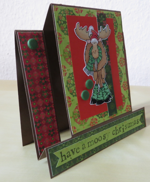 Such is life: I’ve tried for quite a long time today to make a card for a certain challenge and it just wouldn’t come together… and when I gave up and started creating to my heart’s desire, I came up with this one, which perfectly fits the current Sparkles Christmas Challenge: „Christmas Animals„. And my favorite Christmas animal is… the moose! Don’t you love this specimen from Eureka Stamps?