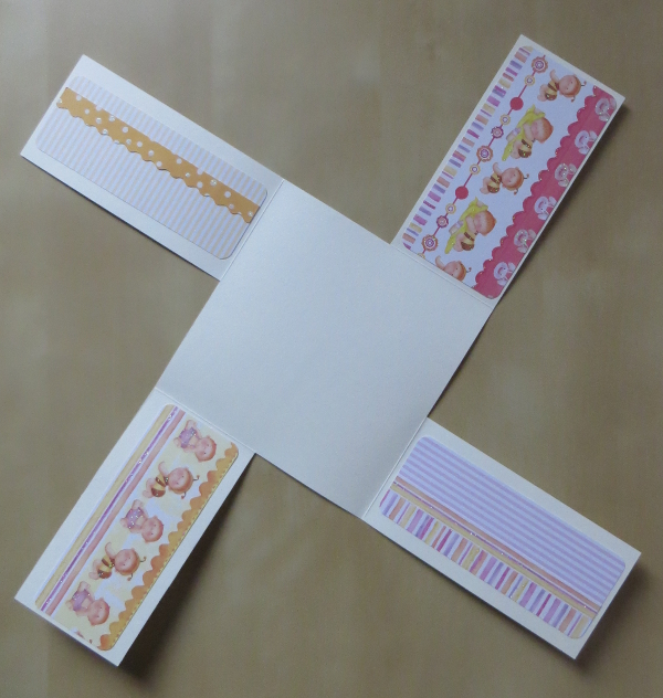 Wie gesagt: Babykarten sind in diesem Jahr mal wieder sehr gefragt… allerdings müsste ich eigentlich mal mehr Richtung Jungen oder zumindest neutraler agieren. Aber die vorliegenden Materialien gaben eben rosa vor. Aber für Umschlagdeko blieb auch noch etwas übrig:
