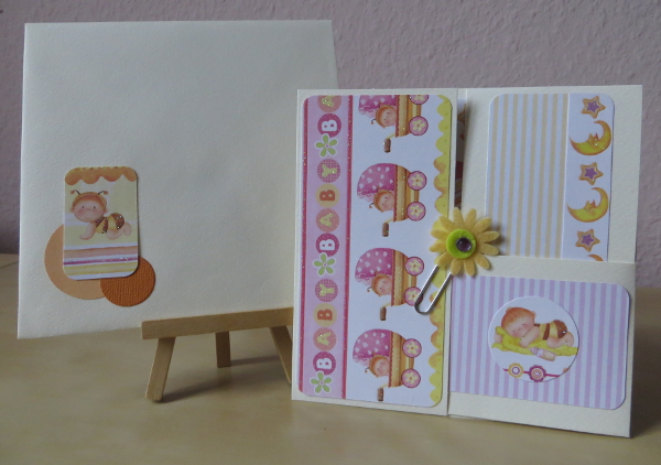 I’ve mentioned it earlier: baby cards are high in demand this year… but really I would have to focus more on boys or at least a bit more neutral. I had some materials, though, part of a „crafting present“ I received, that were pink. And left a little somethig for the envelope as well: