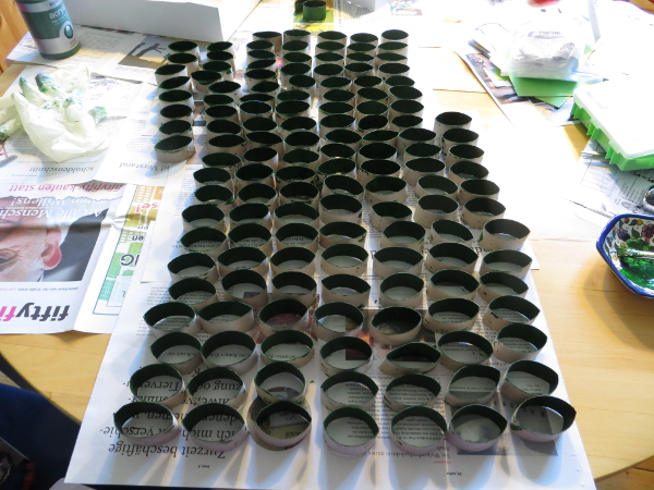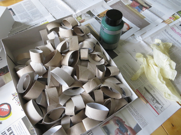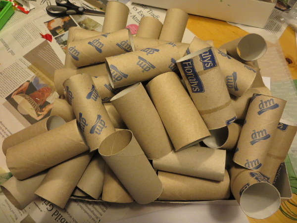 Einen Prägefolder für Birkenwald habe ich nicht und auch keinen entsprechenden Elchstempel. Aber Tapetenmuster und einen ausgestanzten Elch, den mir eine Freundin aus Alaska schon vor vielen Jahre geschickt hat (ja, es mag wie das reine Chaos aussehen in meiner Bastelecke – aber nur für das ungeübte Auge)… Ich weiß jetzt gar nicht, ob das in dieser Challenge okay ist, eine Karte derart zu „CASen“ (Copy and Steal/Share), aber man wird’s mir schon sagen.