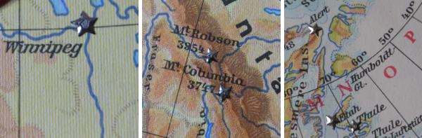 Der Hintergrund ist Seite 122 des Diercke Weltatlas von 1970. Die Weltkugel ist von einer Weihnachtskarte, die Geschäftspartner 2012 geschickt haben. Das rote Geschenkband ist sicher von irgendeiner Pralinenschachtel… und die kleinen Sternchen sind eigentlich ausgestanzte Reste einer Bordüre.