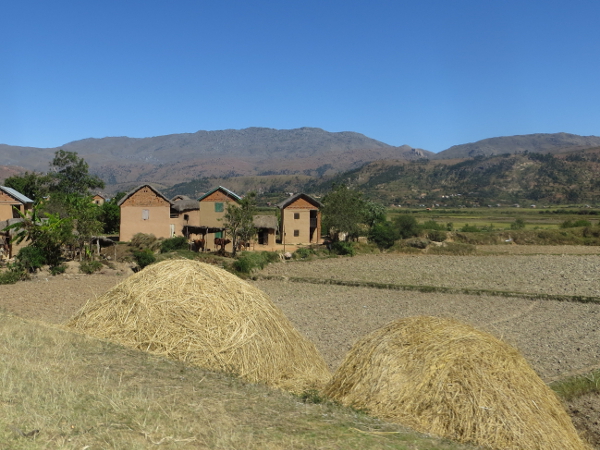 We had a lunch break in a restaurant in Ambositra where we had a view of the rice paddies (ha, pictures not taken out of a moving car!). We kept wondering what these two ladies were busy with – it looked a bit like panning for gold: they put the sheet in the water, lifted it up, looked at the content, dumped it. But they didn’t carry any containers to collect stuff. My final interpretation: finding insects that could damage the crop, crush them and return as fertilizer. But I could be way off.
