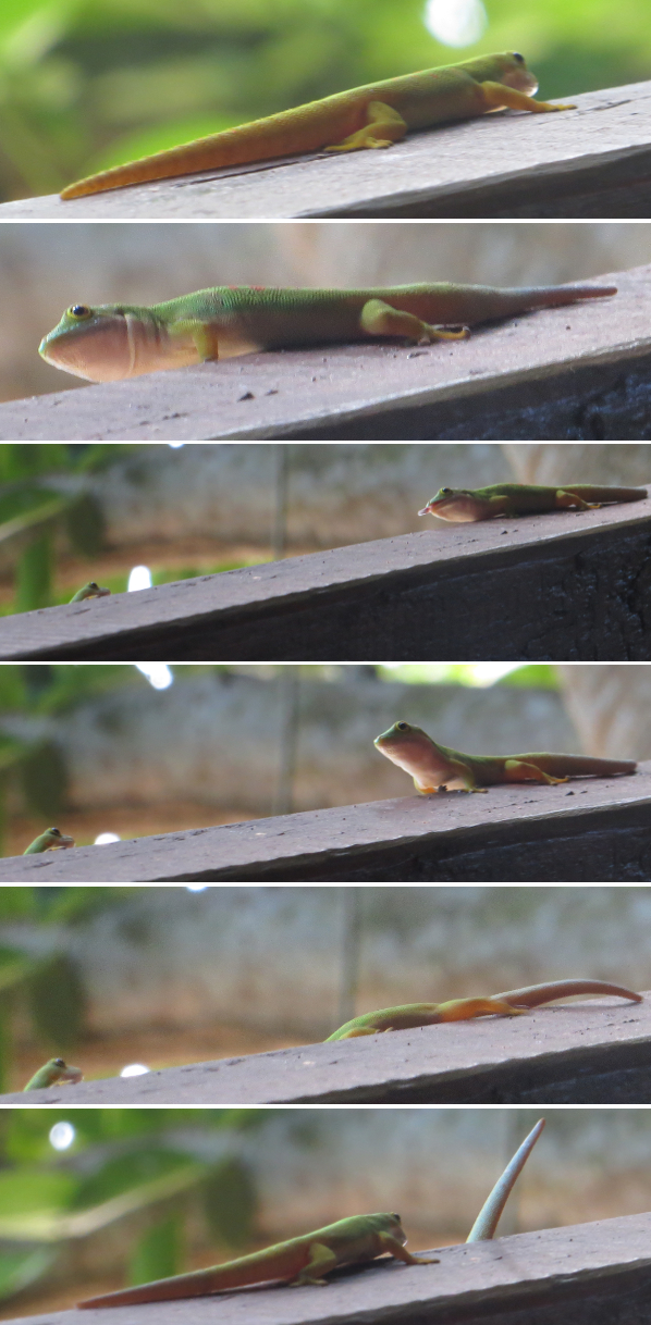 Da habe ich mich eigentlich zwei Tage nicht wegbewegt. Noch nicht mal an den Strand. Zu anstrengend. Außerdem schlabberten die Wellen ja fast bis unter den Baumhausbalkon. Ich habe Geckos beim Revierkampf beobachtet. Oder beim Vorspiel?