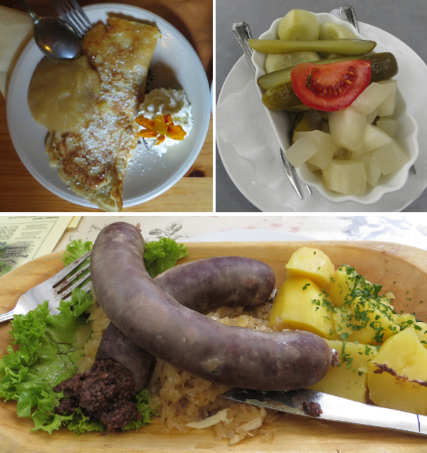 Wir kamen dann im Spreelandmuseum in Lehde an, einem Freilandmuseum. Leider setzte da auch der Regen ein, aber es hat mir trotzdem ausgesprochen gut gefallen. Da es weiter regnete und regnete entschieden wir uns, noch einen nachmittäglichen Snack zu nehmen und auf ein Abebben zu hoffen: mit Hefeplinse (im Bild links oben). Was die kulinarischen Erfahrungen angeht, verstehe ich nun auch den Hype um die Spreewaldgurken. Das erste Mal davon gehört habe ich durch den Film Good bye, Lenin! (!) und habe mich immer gefragt, was das soll… andere Gürkchen sind doch auch gut. Ja, mag sein. Aber die reine Auswahl an verschiedensten Gurken, die dann wiederum noch unterschiedlich eingelegt sind, war doch erstaunlich und sehr lecker. Die Grützwurst hingegen… um es mit Anna zu sagen: „Wenn man nicht darüber nachdenkt, was es ist und nicht guckt, wie aussieht, ist es ganz okay!“ Finnische Diplomatie.