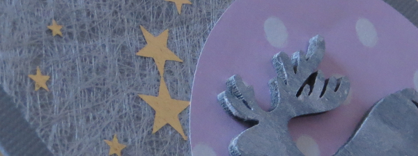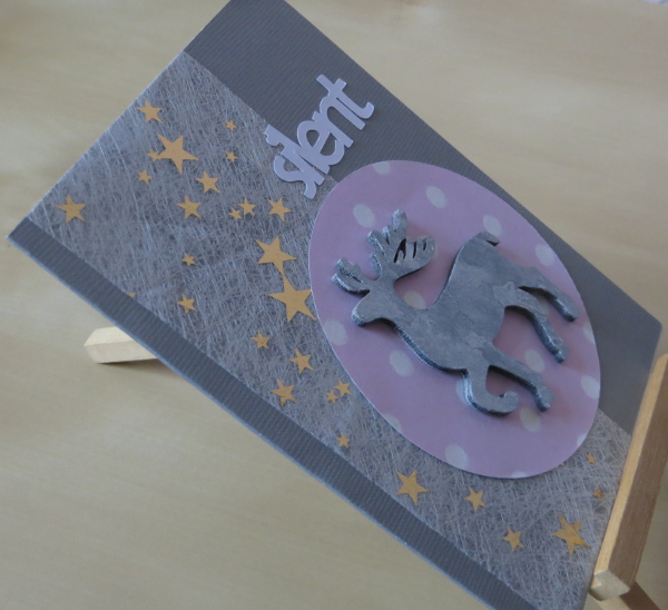 It seems like months have passed since I last created something… and now it’s a Christmas card of a slightly unusual color combo which features new and old elements: the reindeer and the pink paper are new whereas the ribbon with the gold stars is old and recycled – it was part of a Christmas present I received last year.