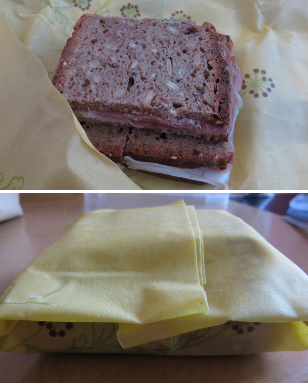 My latest purchase is the so-called Jaus’nWrap. They are cotton rags drenched in bees wax and pine oil that serve to keep food fresh – replacing cling wrap (placing a plate over a bowl in the refrigerator works well, too, in case you didn’t know). An ingenious engineer from Austria had the idea. As with the shampoo, the purchase was pricey but so far my experiences with it are very good.