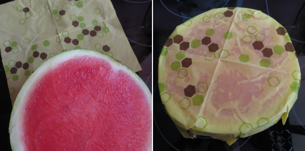 Bislang habe ich sie getestet als Verpackung für ein Butterbrot, als Bedeckung für eine halbe Wassermelone, über einer Schale mit einem Rest Nudeln mit Tomatensauce und als Schutz für einen halben Apfel. Alles hat sehr gut funktioniert. Die Kontaktflächen am Fruchtfleisch haben einen Hauch von Bienenwachs angenommen, aber das fand ich nicht störend. Das praktischste ist, dass man das Tuch zwischen zwei Händen quasi verschweißen kann: das Wachs wird warm und dann pappen die Lagen aneinander fest. Natürlich werde ich Frischhaltefolie nie ganz verbannen können: wie sollte ich sonst Zimtsterne backen? Im Umgang mit dem klebrigen Teig hat man nur eine Chance, wenn man ihn zwischen zwei Lagen Frischhaltefolie ausrollt… Habt einen schönen August!