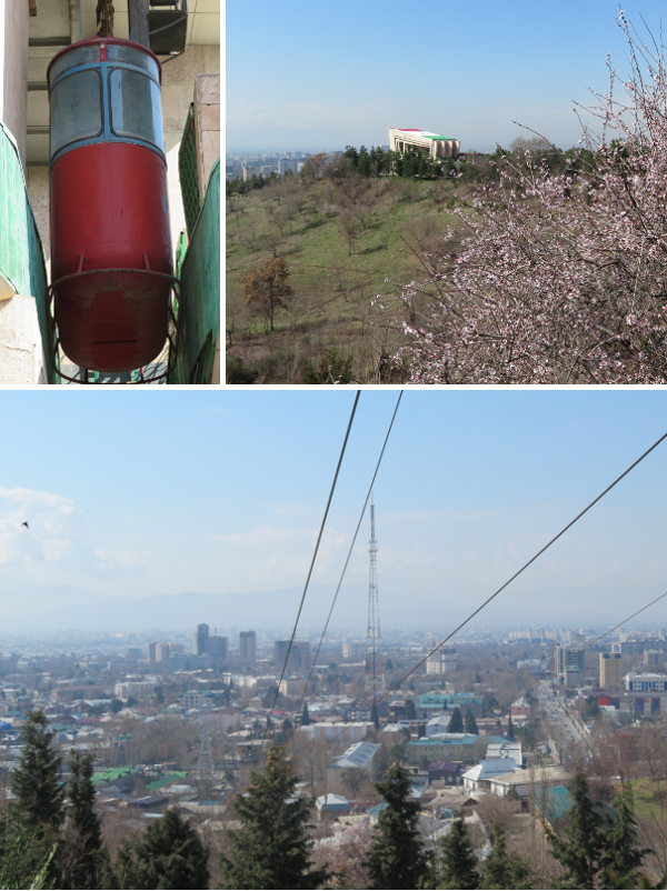 The gorgeous weather is still with us and so we spent another afternoon outdoors and went up to the Victory Park, above Dushanbe. It’s only a few minutes‘ ride from the city center, going uphill through a park and reaching the funicular on the top. It hasn’t been used in years but you can still marvel at the godolas.
