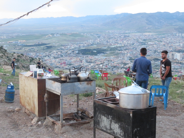 Am letzten Abend in Dohuk, nach einer vertrackt anstrengenden, aber auch wunderbaren zweiwöchigen Dienstreise, bin ich mit zwei Kollegen noch schnell auf „den“ Berg (als gäbe es hier nur den einen…), um den Tag bei einer Tasse Tee im Sonnenuntergang ausklingen zu lassen.