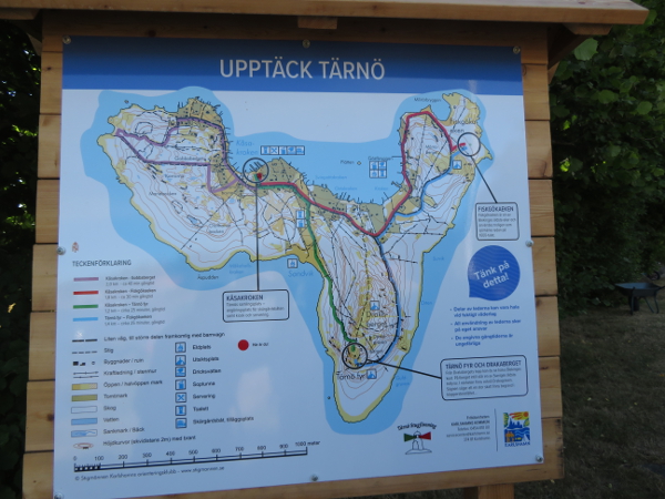 Tärnö hatte es mir dann auch direkt angetan… die Insel hat keine dauerhaften Bewohner mehr, es sind nur noch Sommerhäuser. Geteerte Straßen: Fehlanzeige. Autos: Fehlanzeige. Geschäfte und Restaurants: Fehlanzeige. Ein kleiner Kiosk am Hafen, wo ich das in der beschriebenen Hektik vergessene Wasser aufstocken konnte, und kleine Kieswege in die lockere Bebauung mit malerischen „Schwedenhäuschen“. Hatte schon was von Saltkrokan. Vielleicht war auch die Form der Insel gleich überzeugend: sieht sie nicht aus wie ein Elchkopf mit Geweih?