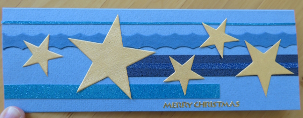 And I continue to make Christmas cards! The current challenge over at Sparkles Christmas Challenges is to create cards in blue and gold. I’ve had these oblong cards for a while – and a few more scraps to use. This is what came of it:
