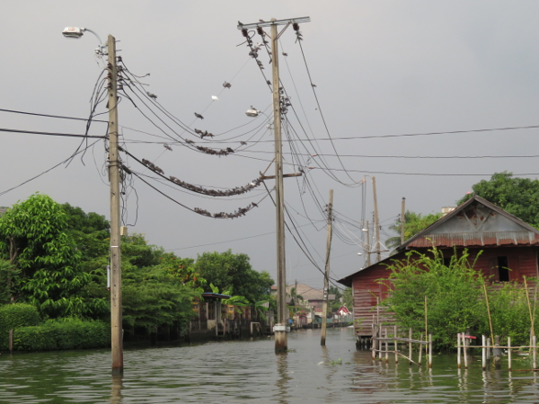 Ein weiterer Teil unserer Tour war ein Einblick in ein Verkehrssystem und einen Lebensraum, der Bangkok ursprünglich ausgezeichnet und für den Spitznamen „Venedig des Ostens“ gesorgt hat: die Khlongs (Kanäle). Die Stadt befindet sich im Deltabereich des Chao Phraya Flusses und viel bebaute Fläche ist ehemaliger Sumpf. Von der Hochzeit dieses Kanalsystems ist nicht mehr viel übrig geblieben, denn schon seit Ende des 19. Jahrhunderts wurden Kanäle zugeschüttet und durch Straßen ersetzt. Die massive Urbanisierung (1950 überschaubare 1 Mio. Einwohner, 2010 schon 8,3 Mio.) und Industrialisierung führten zu einer ungesteuerten Überbauung. Flächennutzungspläne sucht man wohl weiterhin vergebens.