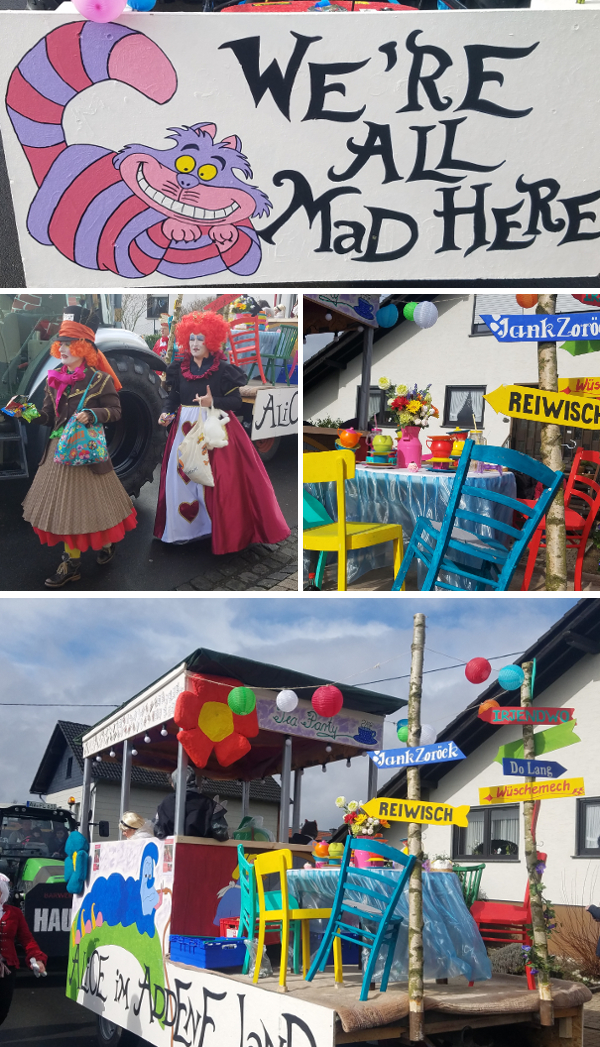 Wir haben einige sehr schöne Wagen und Fußgruppen gesehen und für ungefähr die Hälfte der Wegstrecke hat auch das Wetter mitgespielt (bevor es dann richtig fies wurde) – für mich der schönste Wagen allerdings war der von Alice im Wunderland, äh, Addene Land.