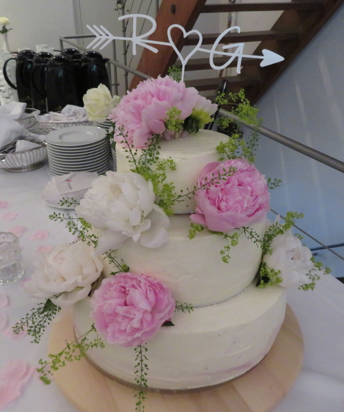 Ich hatte zwar nichts damit zu tun, aber es muss Erwähnung finden, wie wunderbar diese Hochzeit war. So viele liebevoll gestaltete Details, die Deko wunderschön… und dann noch eine Wahnsinnstorte, die eine (weitere) Kollegin gebacken hat. Ganz unten Himbeer-Zitrone mit eine Hauch Holunder, in der Mitte Schokolade und Heidelbeeren, oben auf besonderen Wunsch einen Sandkuchen. Abgesehen von lecker und an sich schön anzusehen, passte auch sie perfekt in die Deko.